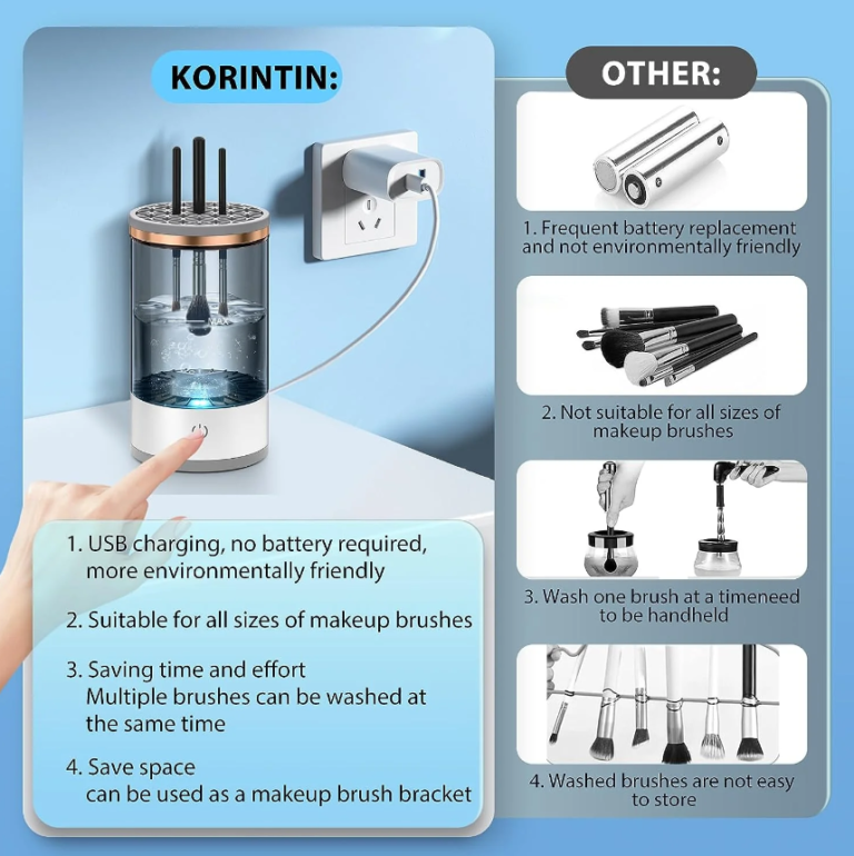 Its make up brush clean machine can deep cleans your brushes so effortlessly. The thick silicone bowl can be removed to hand wash. It is time saver and uses less water. It is great for cleaning makeup brushes & makeup sponges. It can effectively strip away makeup residue, bacteria and dirt from makeup brushes, quickly clean and leave brushes like brand new keep brush its’ original shape. Simply plug in the USB cable just add appropriate amount water and cleanser then turn on/off. It’s important to keep makeup brushes tools clean so that keep away from skin problems which can really make a healthy skin.